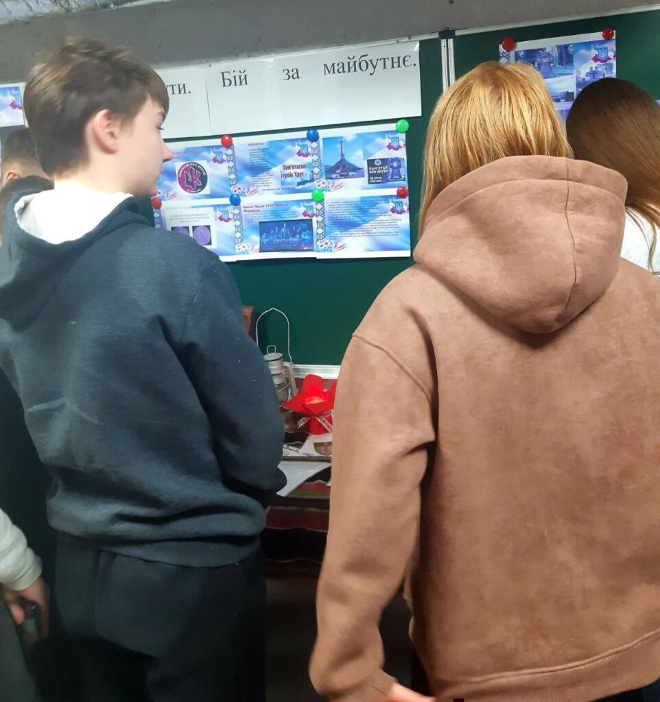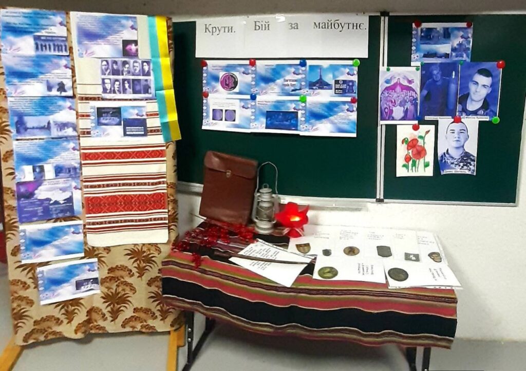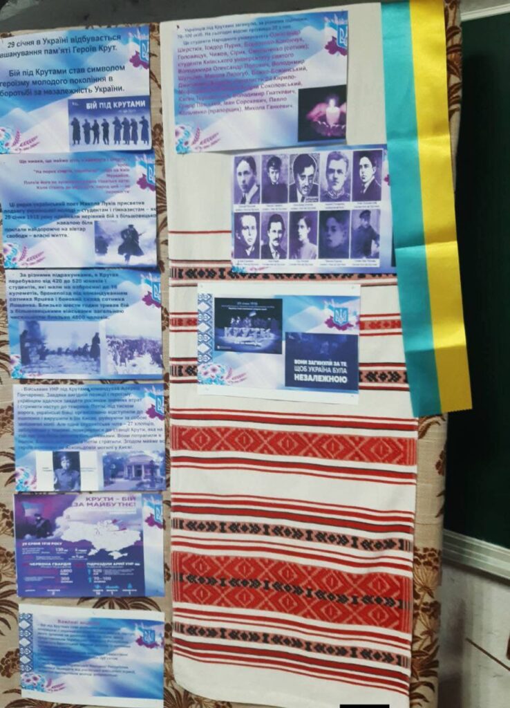 Учні 8-А класу Запорізької гімназії № 19 долучилися до вшанування пам’яті Героїв Крут, відвідавши виставку-інсталяцію «Крути. Бій за майбутнє», підготовлену бібліотекаркою закладу Іриною Михайлівною